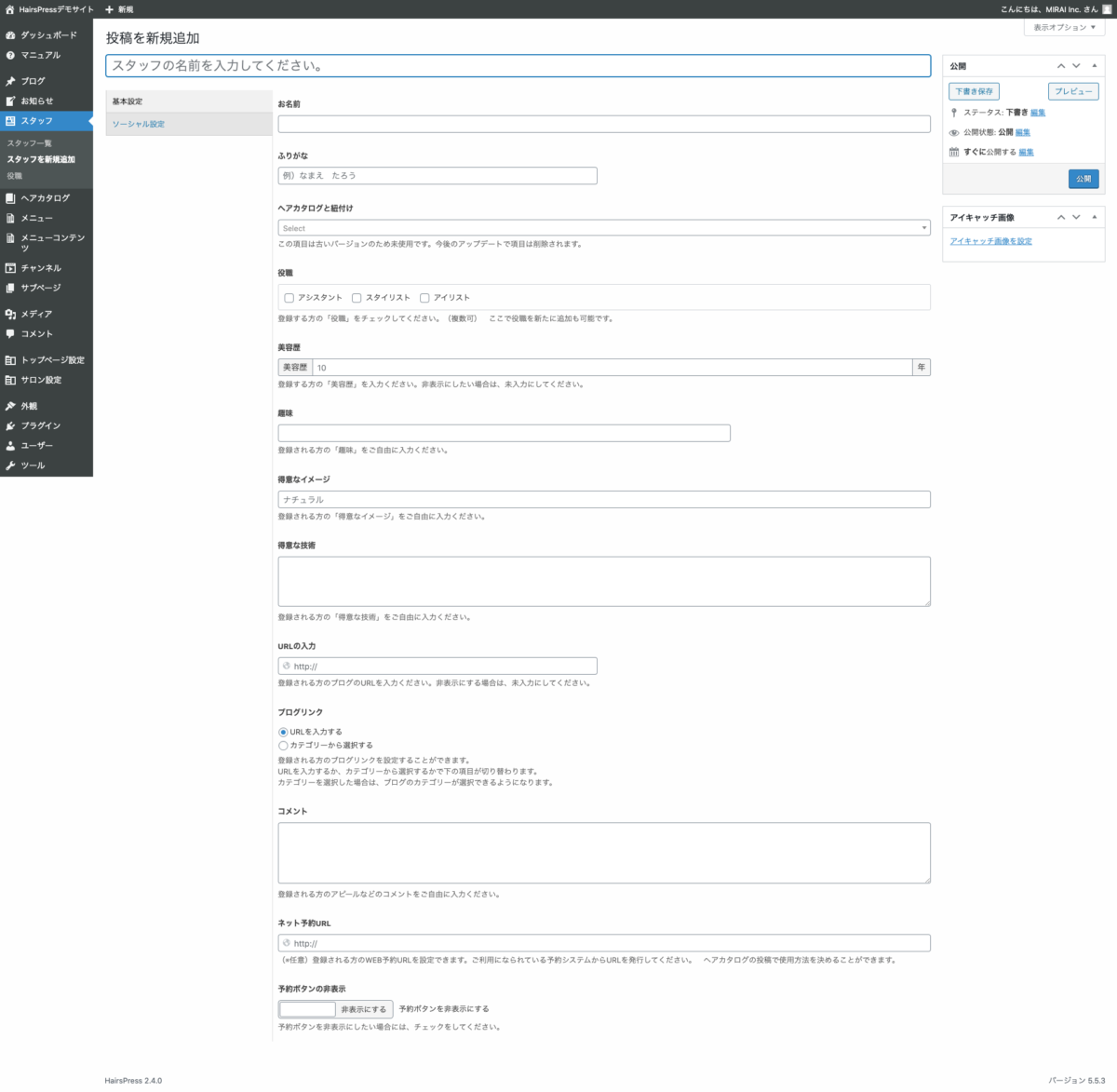 【新規登録】左メニュー「スタッフ」を選択→「スタッフを新規登録」