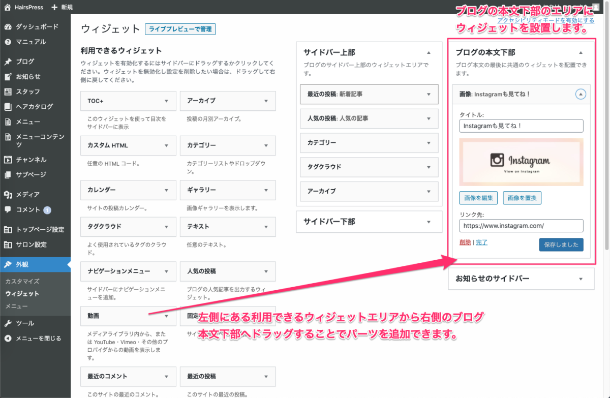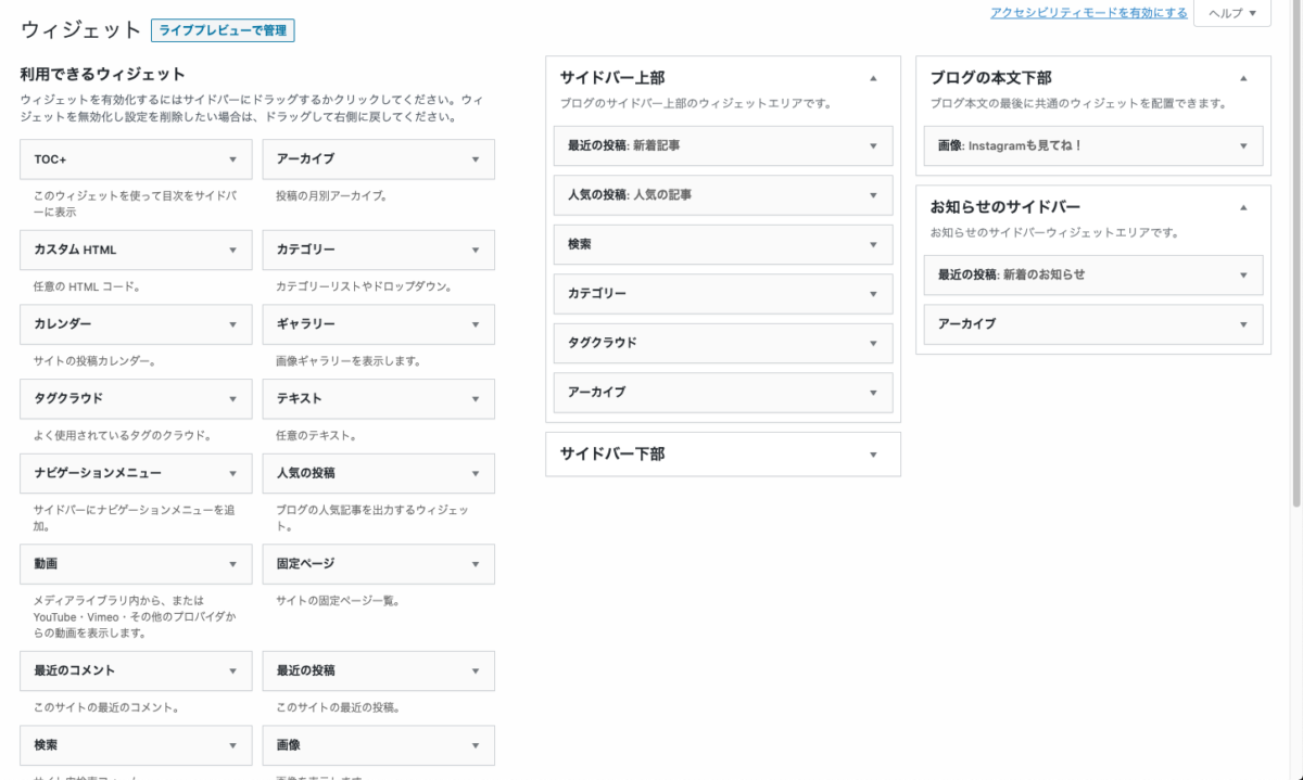 管理画面では以下の画像のようになっており、ドラッグ&ドロップでウィジェットを配置できます。