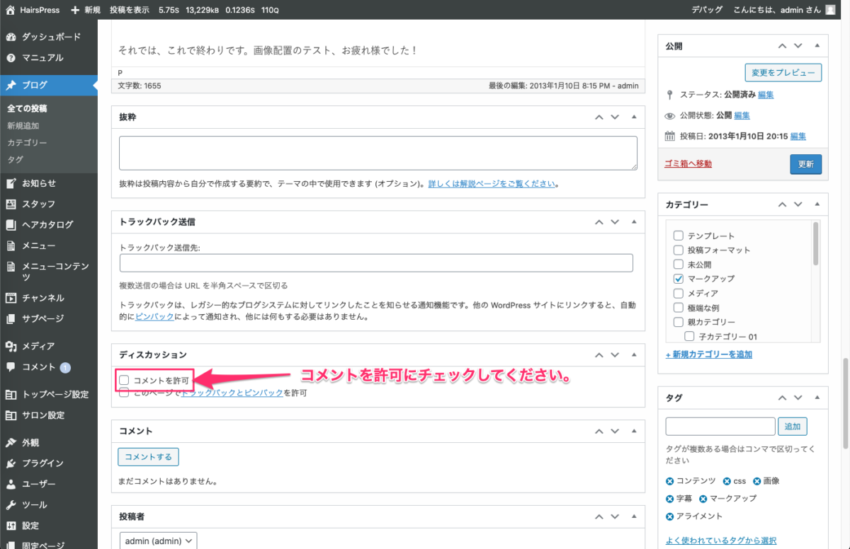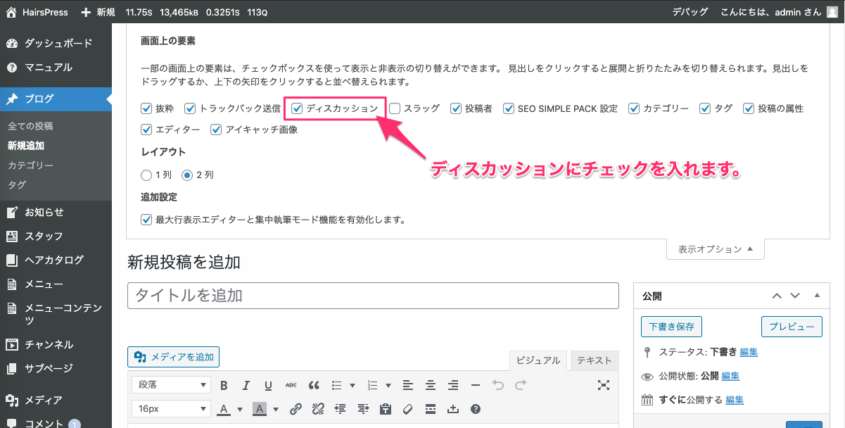 こちらをご利用する場合は、パソコンから管理画面にログインしていただき、コメント機能を利用したい投稿の編集画面まで行き、「ディスカッション」の枠にある「コメントを許可」にチェックを入れてください。